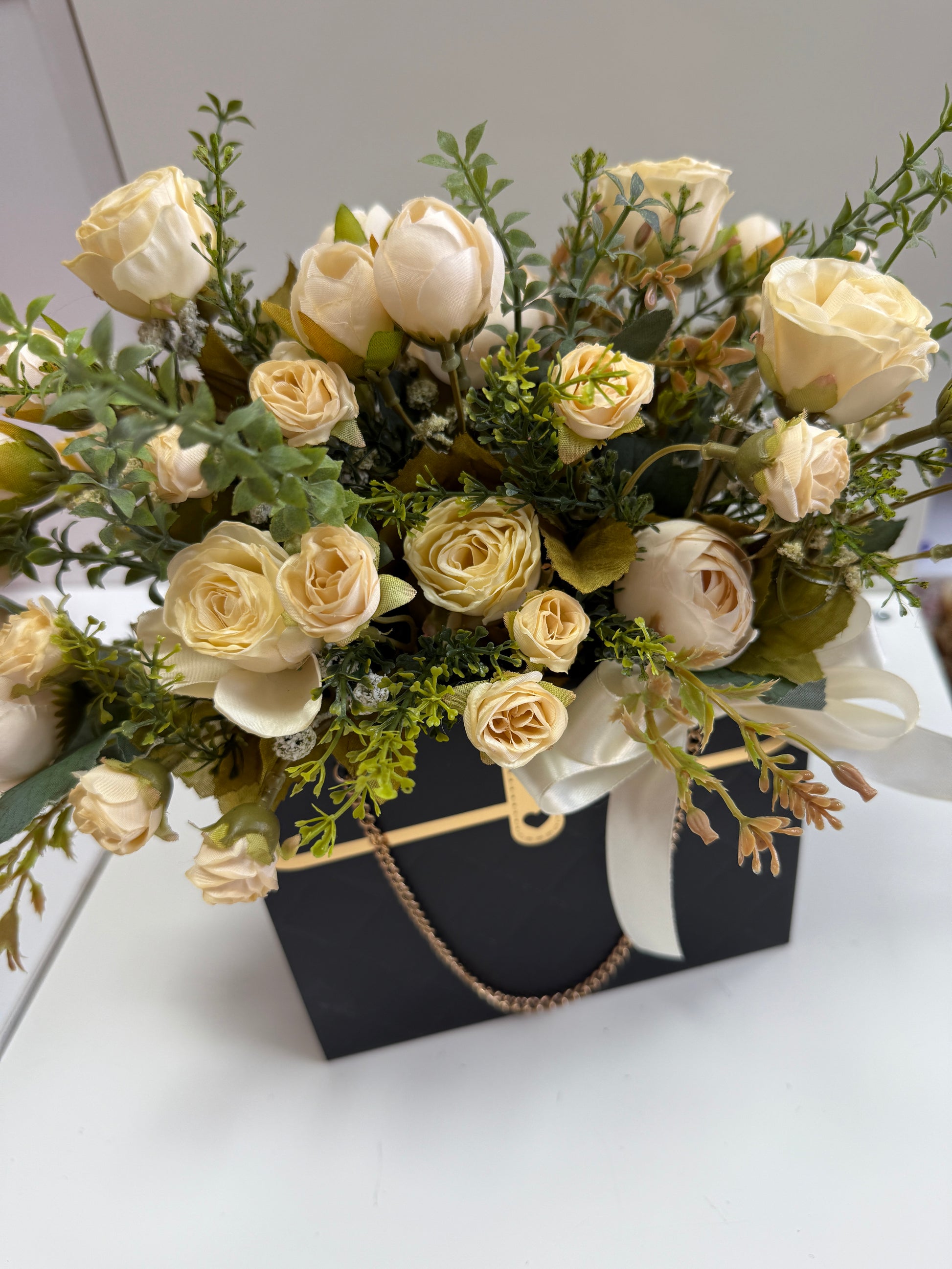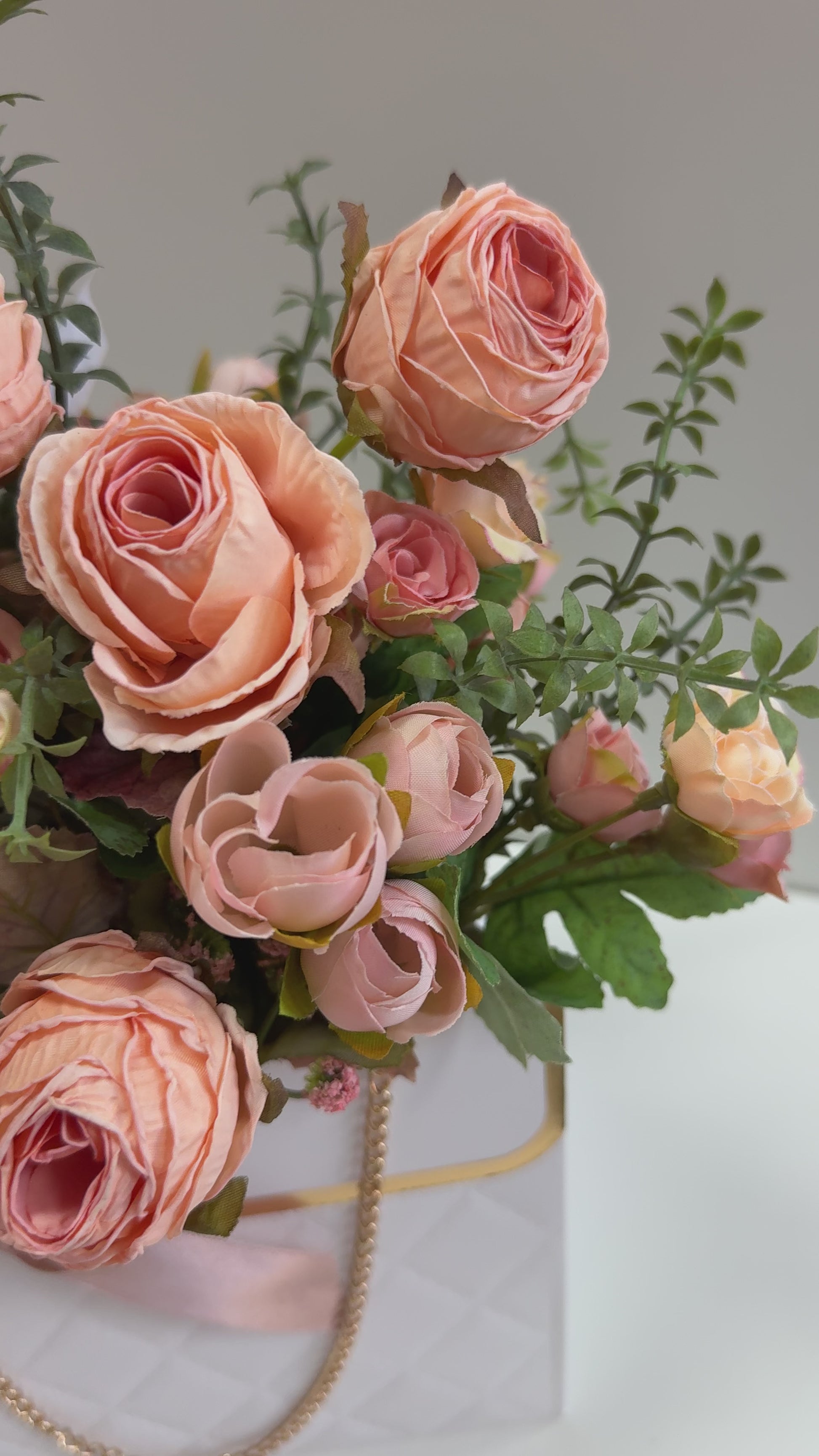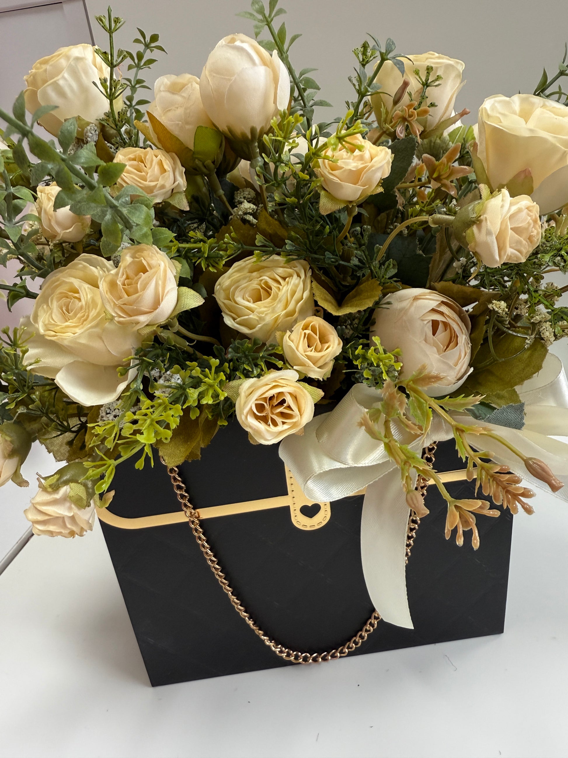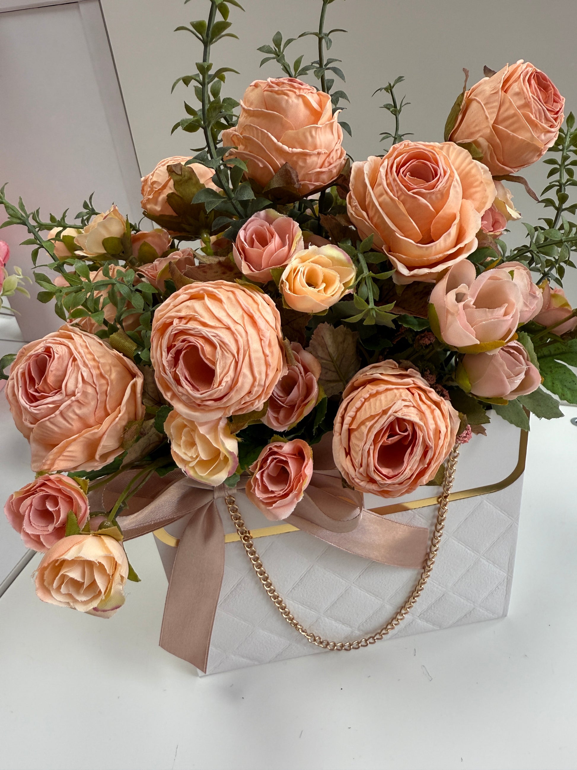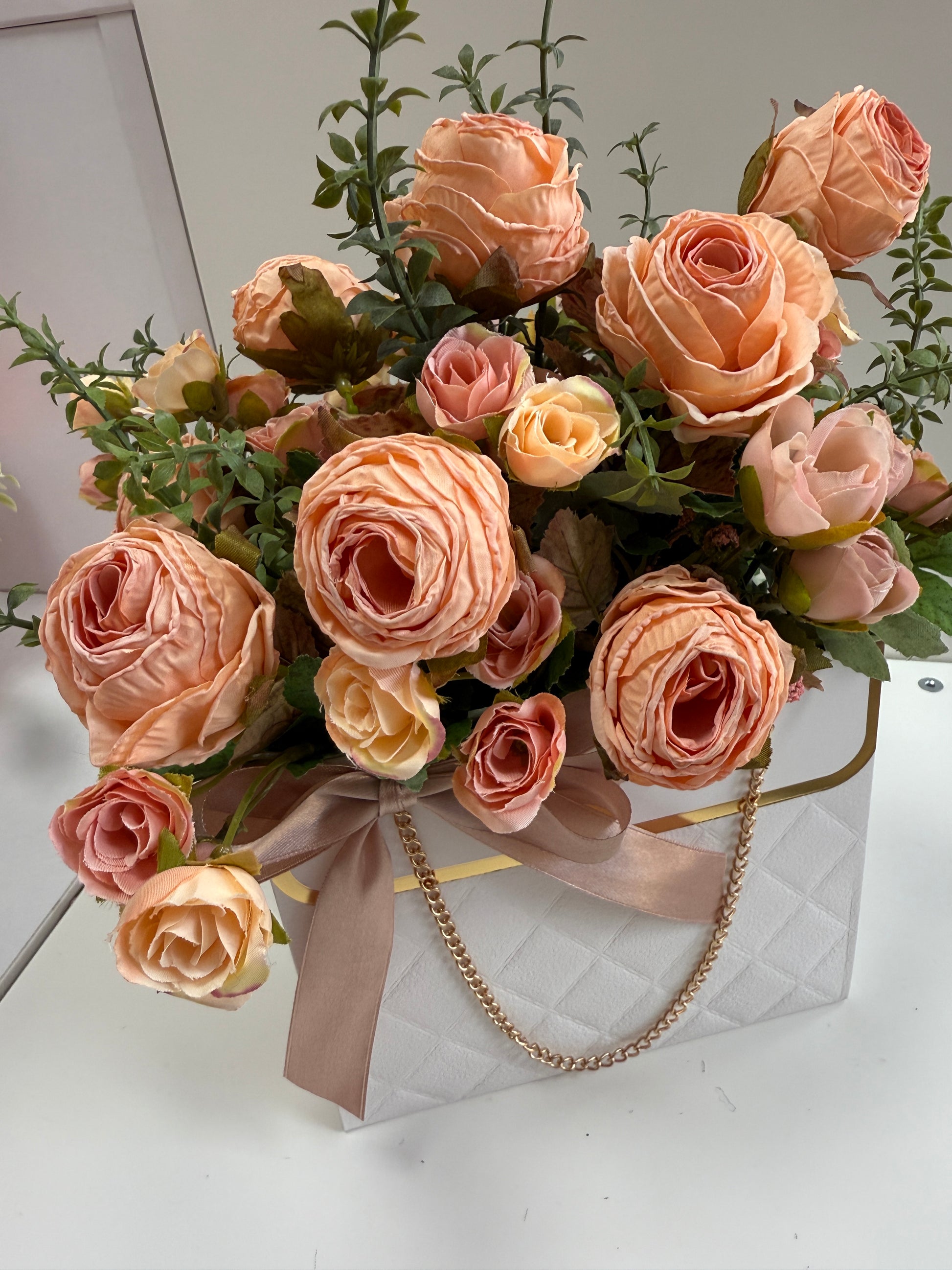 Различен подарък за рожден ден, годишнина или просто без повод – поднесете елегантна изненада на свой любим човек и приятел. Предлагаме една сладка малка чанта, фино декорирана с копринени изкуствени цветя. Подходяща е и за украса на дома и офиса - внася свежест и настроение във всяко кътче.