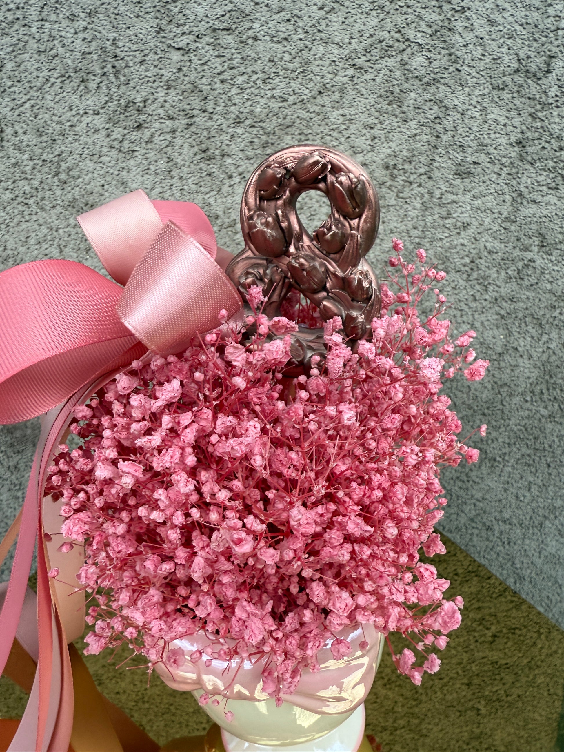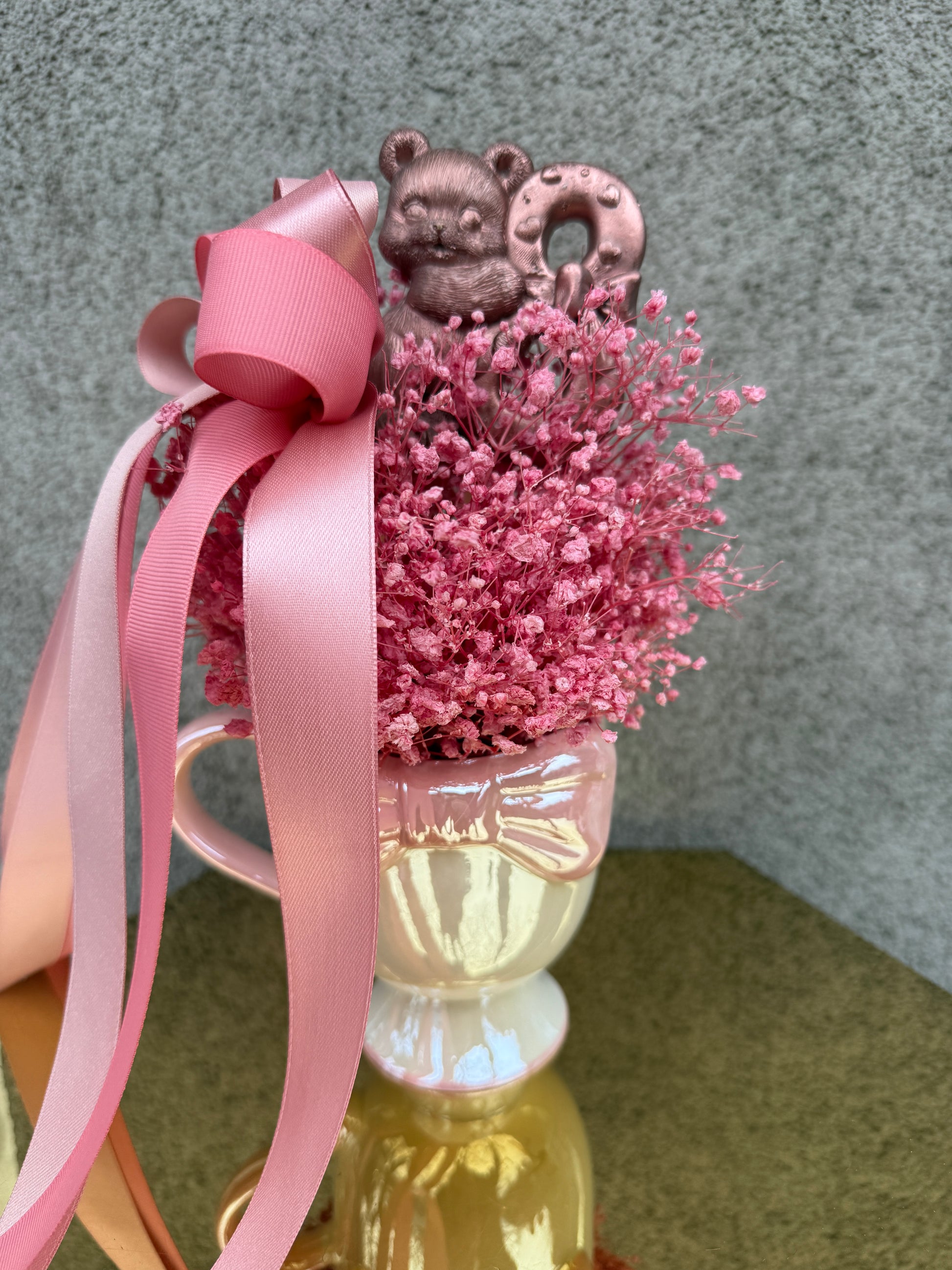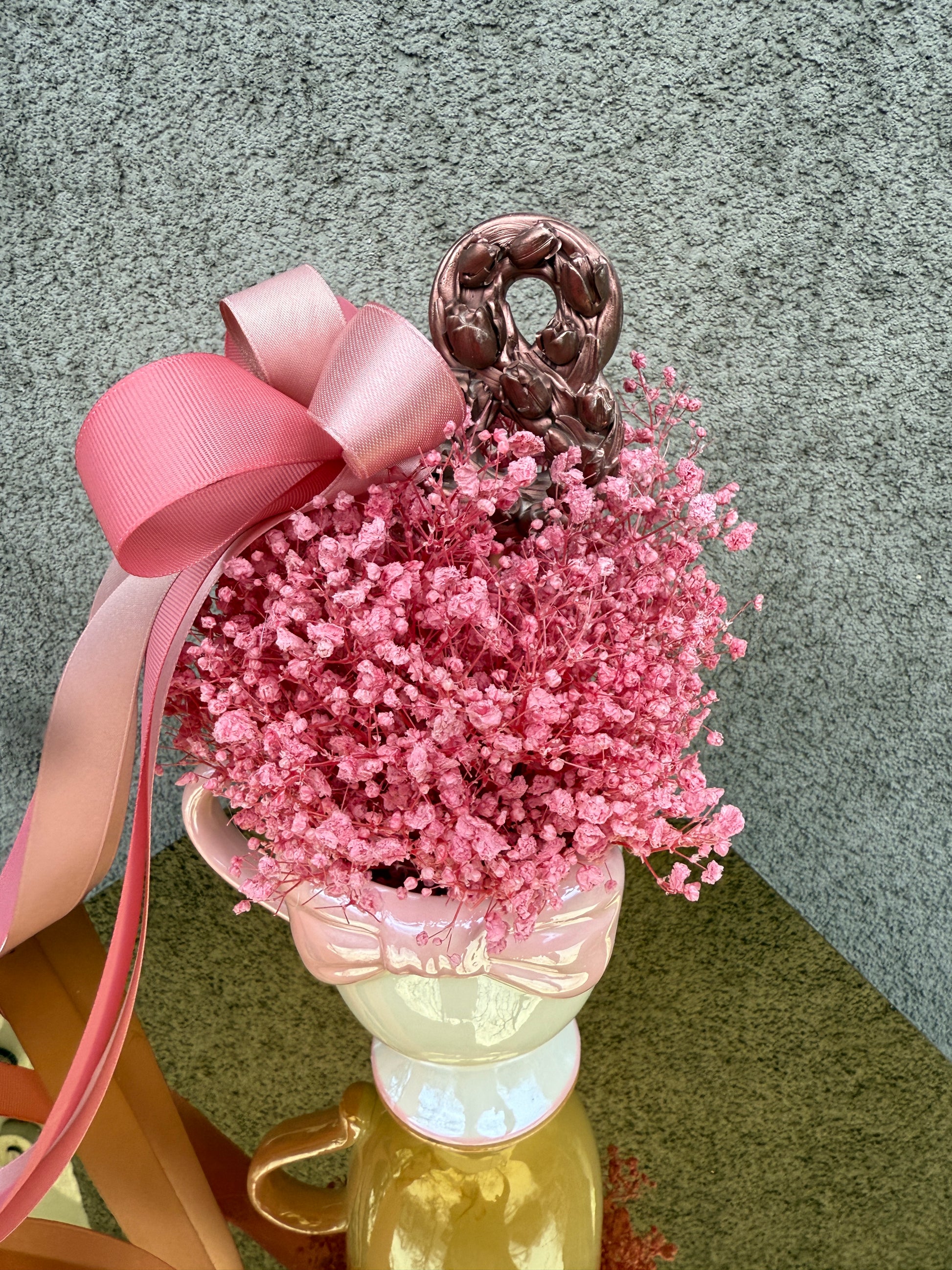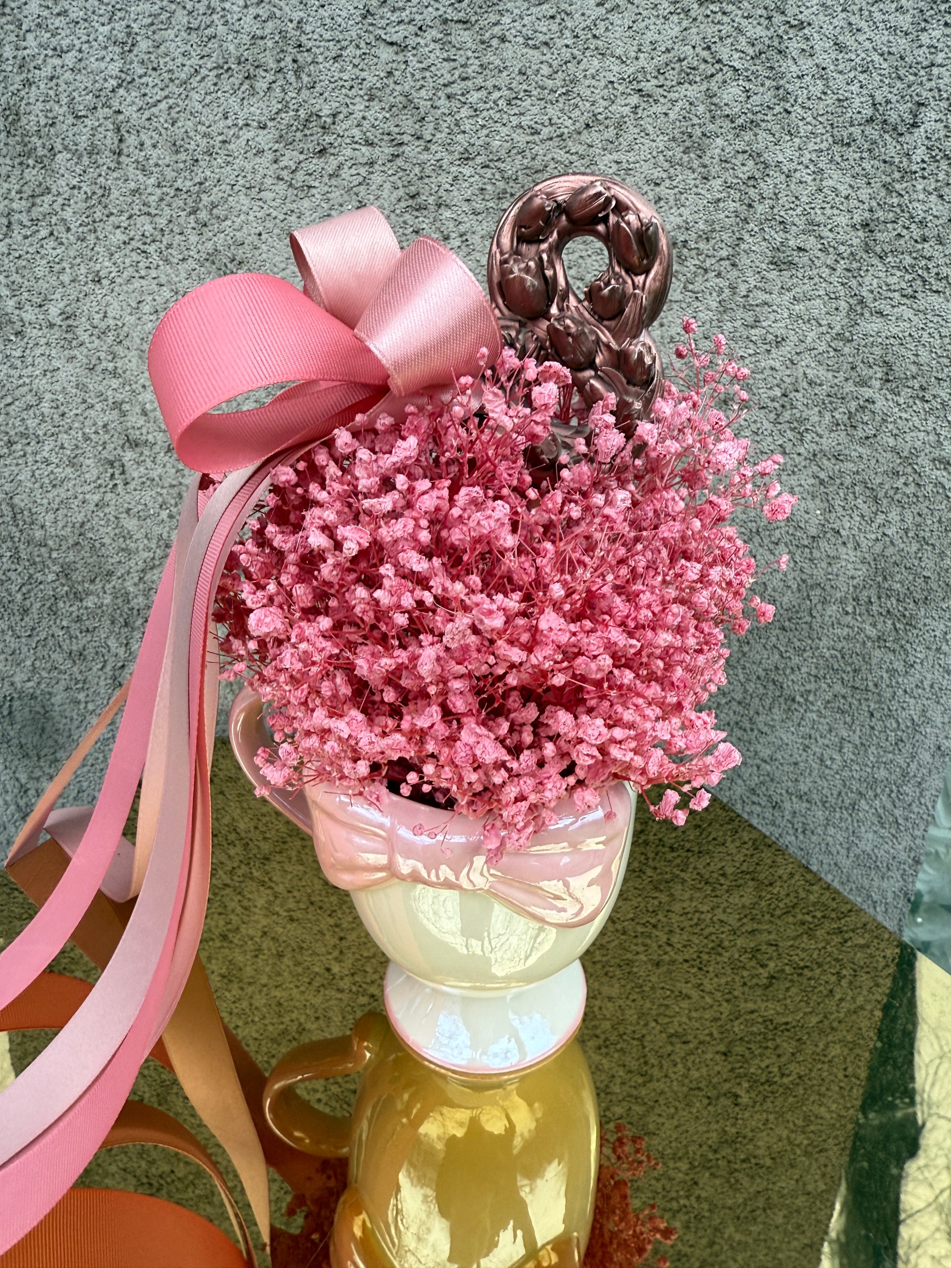 Изящен декоративен акцент, съчетаващ елегантността на класическата чаша с красотата на внимателно подбрани сухи цветя. Стилна панделка придава завършен и изискан вид. Идеален подарък за рожден ден, за 8 март или друг специален повод. Всяка аранжировка се изработва ръчно с внимание и любов, което я прави уникална и специална.