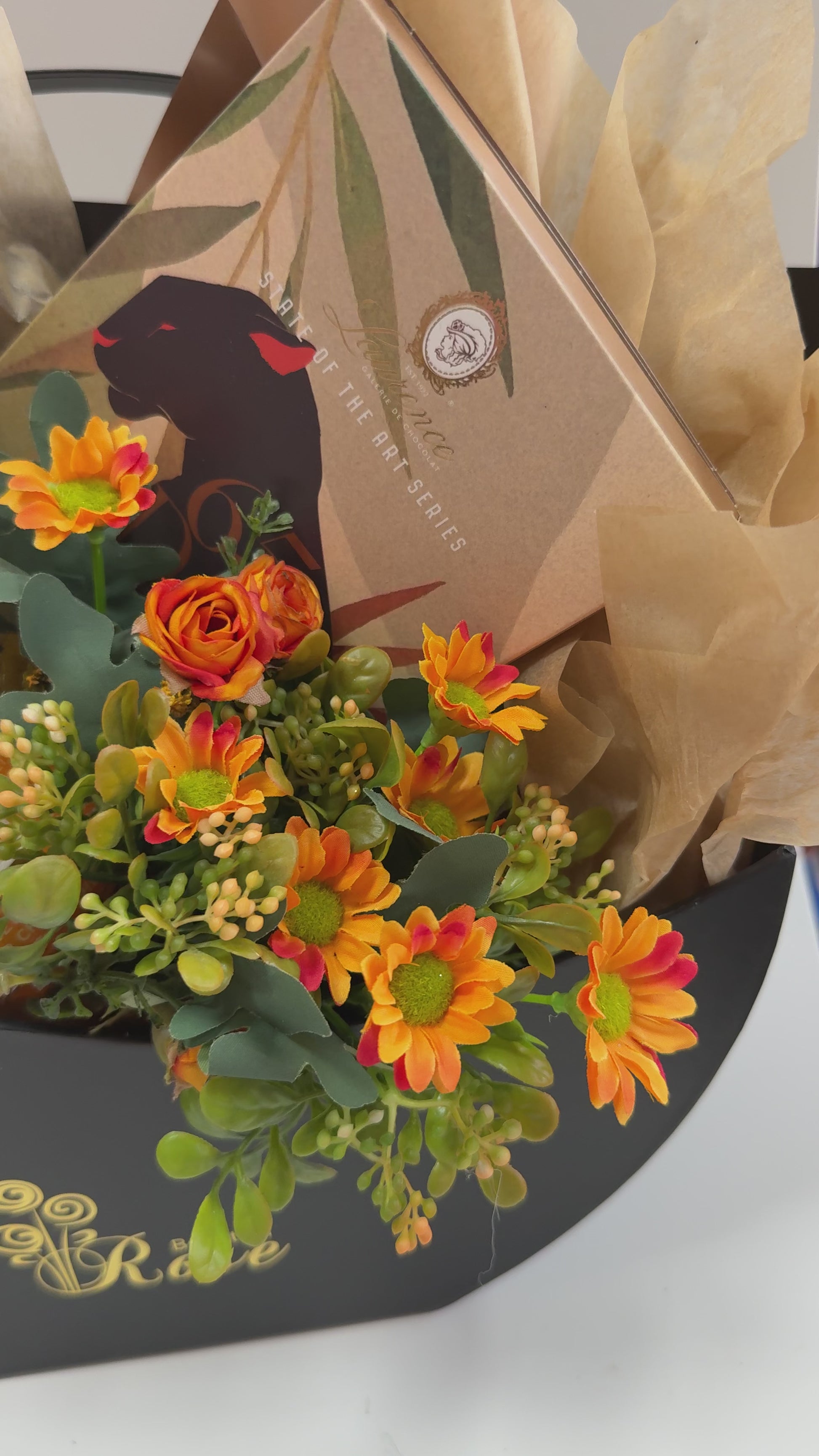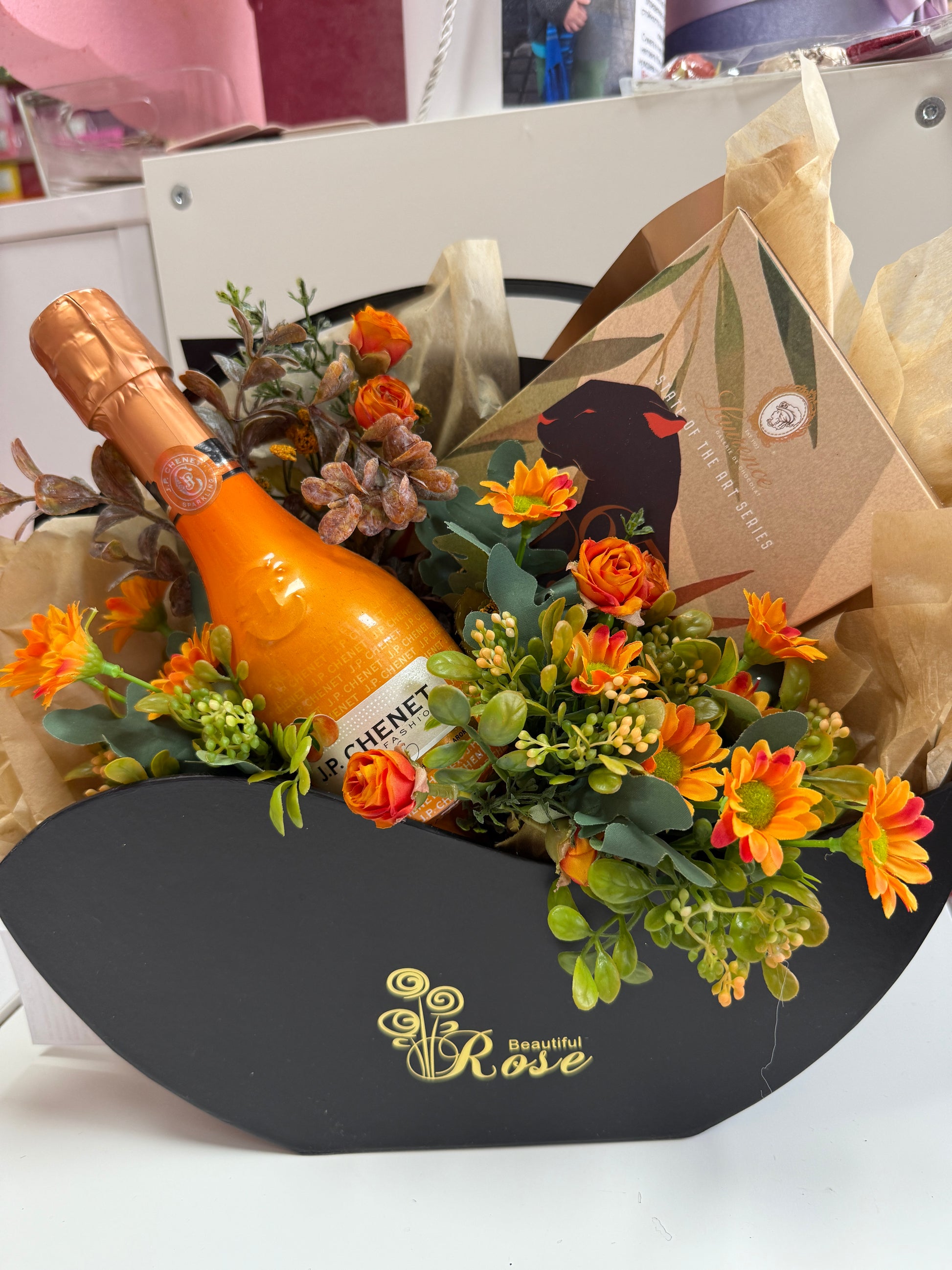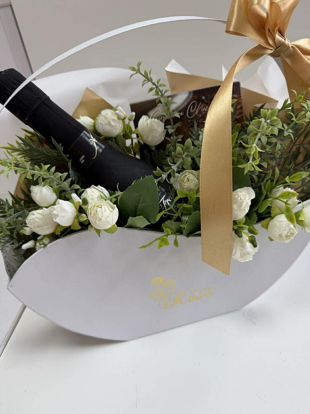 Подарък изящна кошница с красиви копринени цветя и сладки изкушения... и то какви! Отлично предложение за ефектен подарък, подходящ и за мъж, и за жена. Съдържа мини бутилка луксозно шампанско, 1 луксозен шоколад.
