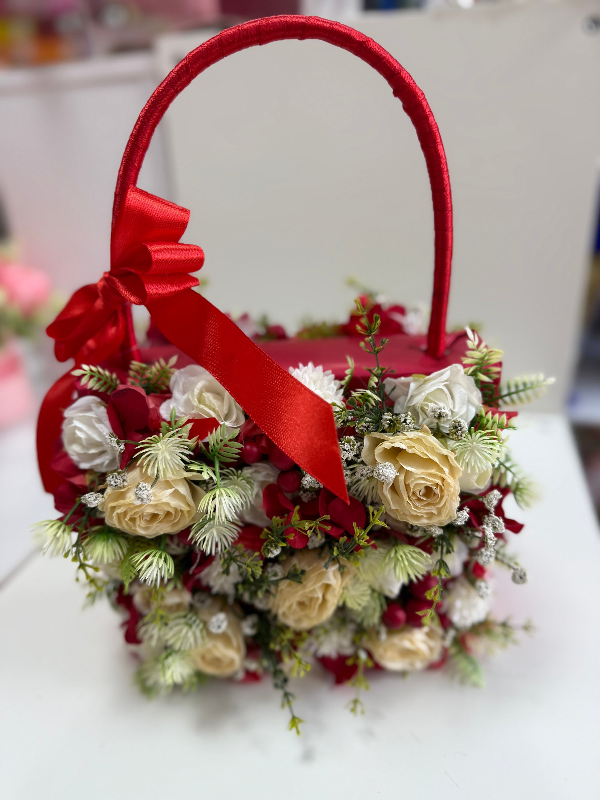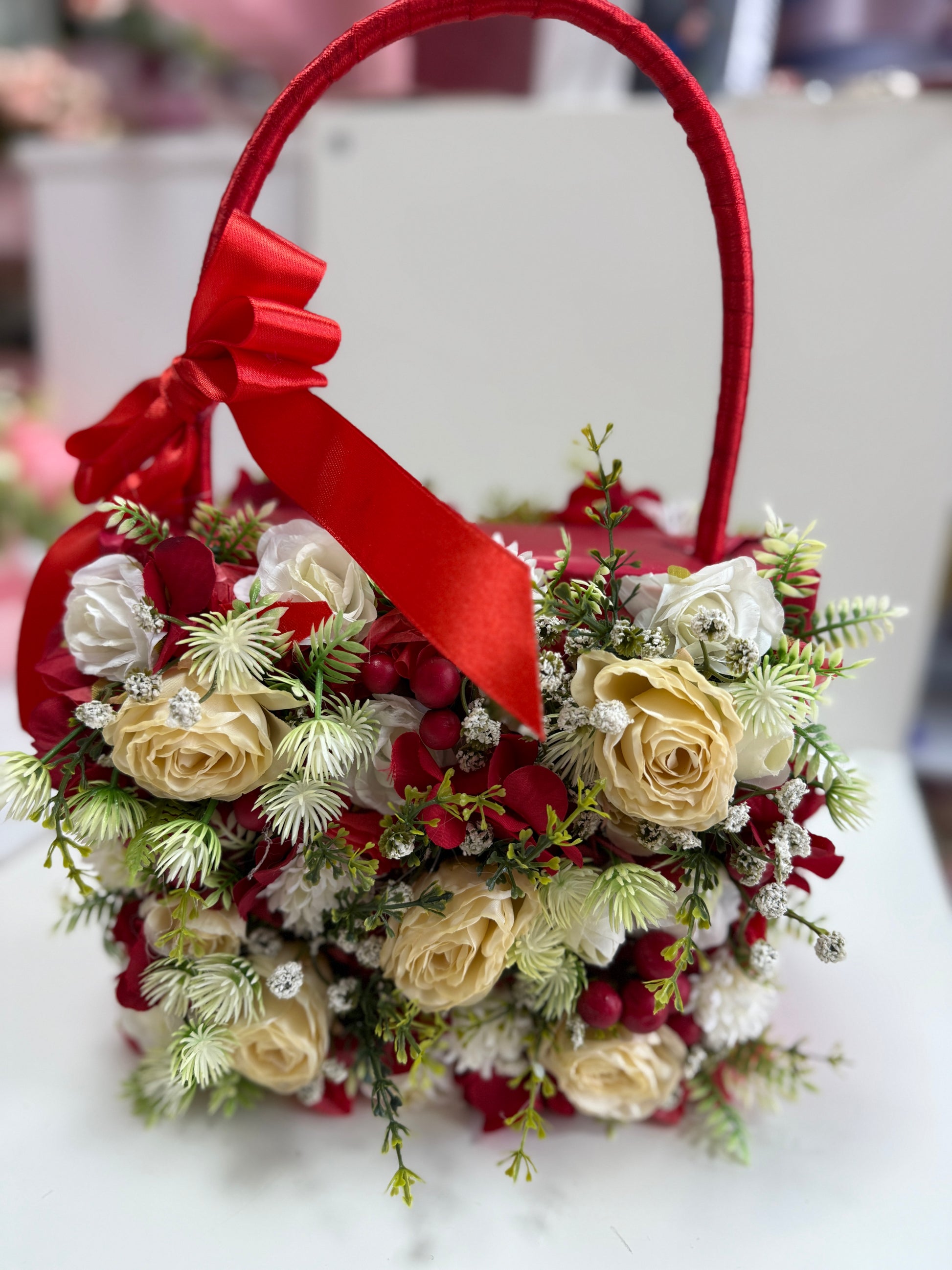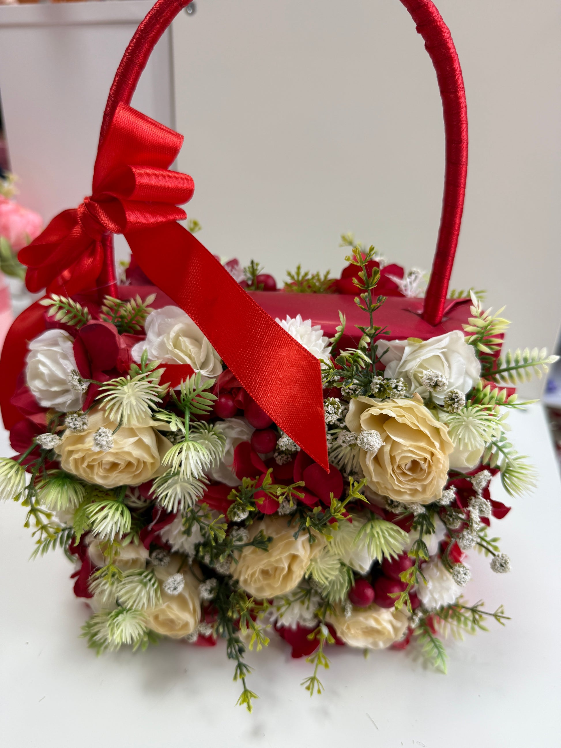 Изящна аранжировка от копринени изкуствени цветя, създадена за специални поводи, за да изрази нежност и стил. Вдъхновена от естествената красота на разцъфналите цветя, композицията съчетава усещане за хармония от форми и цветове, които се допълват съвършено. Подарете настроение, подарете цветна емоция.