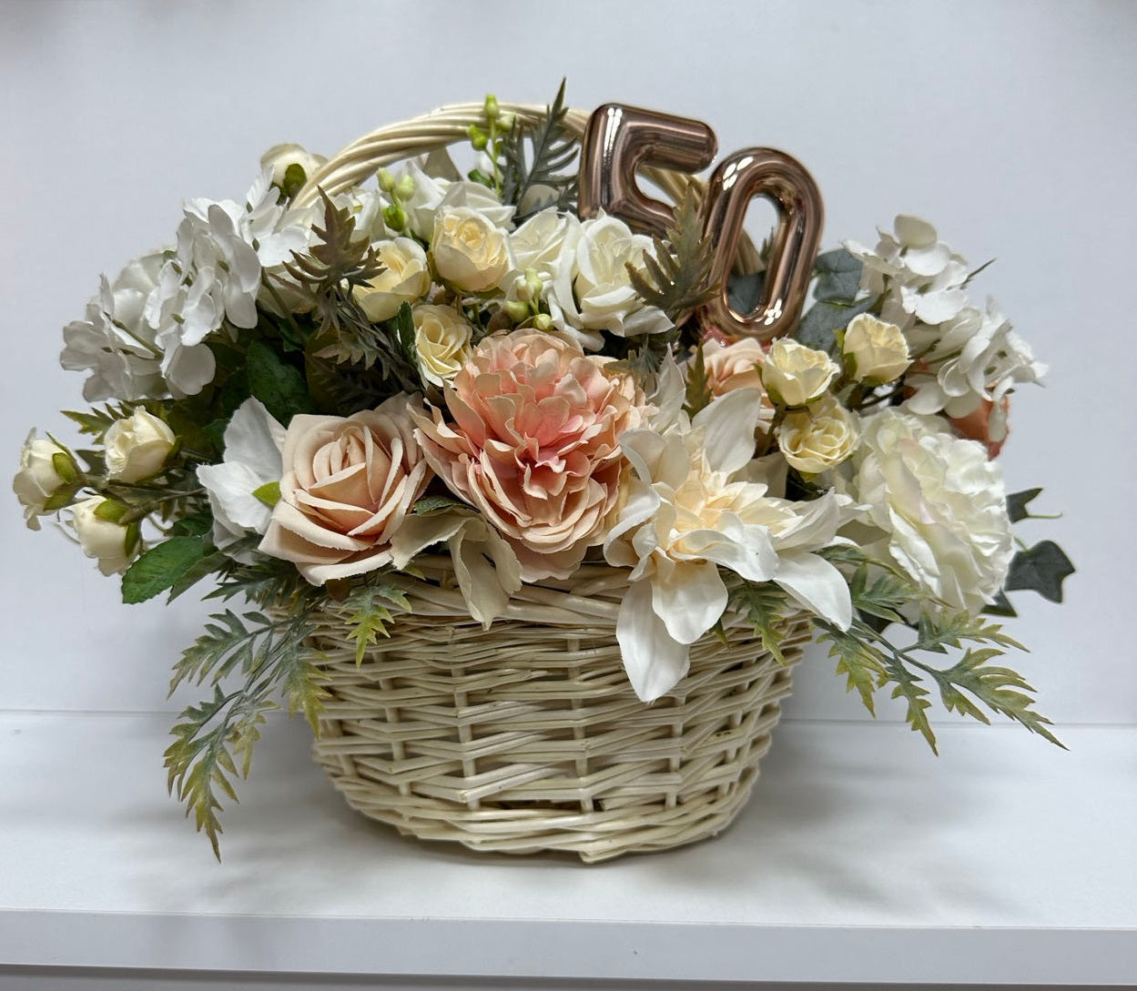 Елегантна декорирана кошница, изработена от ратан и копринени изкуствени цветя – идеален подарък за рожден ден. Подходяща е и за украса на дома и офиса, тя е лесна за поддръжка и внася свежест и настроение във всяко кътче. Можете да изберете сами цветята и кутия или кошница, които ви харесват и ние ще ги декорираме за вас.