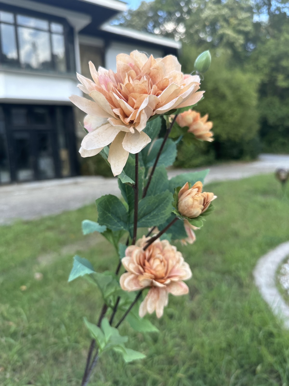 Красива изкуствена далия с 5 перфектно оформени цвята. Височината е 86 см, залесената част е 50 см. Подходяща за различни аранжировки. Предлага се в 5 цвята.